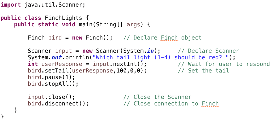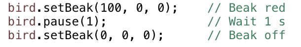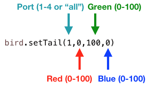 In this lesson, you will learn to use more of the Finch outputs. You will learn to control the lights in the Finch’s beak and tail. Each of the lights in the beak and tail actually has three tiny light elements inside it. One is red, one is green, and one is blue. This is important for programming the lights.