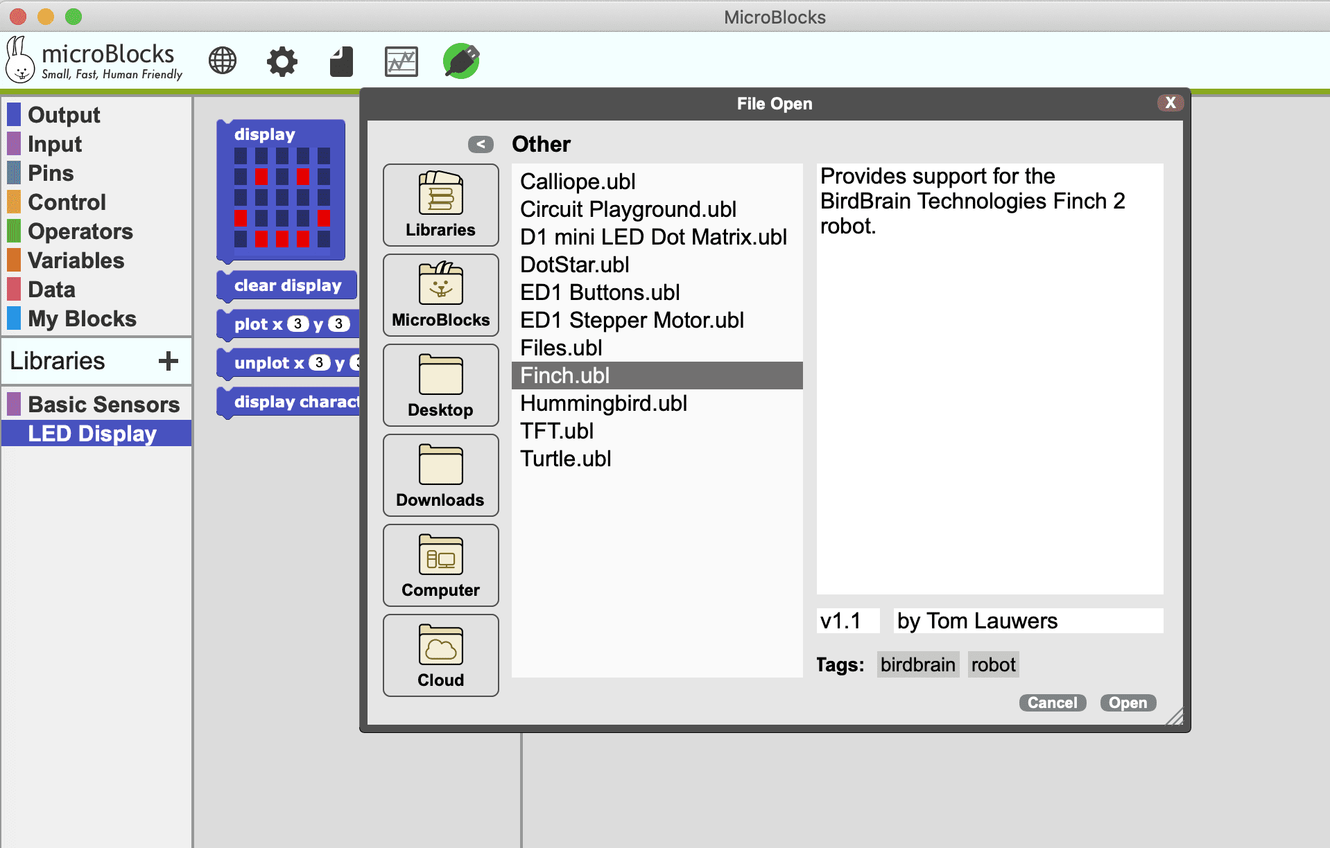 To use MicroBlocks with the Finch, you will need a computer – Windows, Mac, Chromebooks, and Linux are all supported. Start by downloading and installing MicroBlocks from this page.