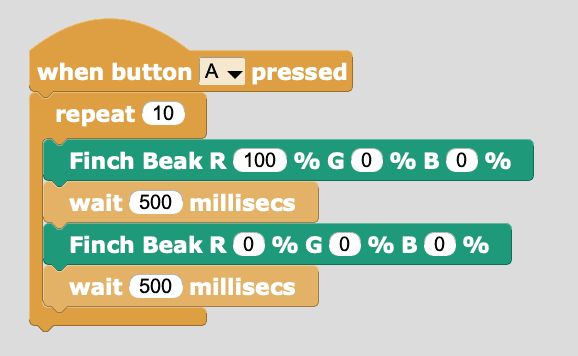 As you write programs, they are automatically downloaded to the micro:bit. As an example, this program makes the beak blink 10 times when button A on the micro:bit is pressed. All the yellow blocks can be found on the Control menu. Run this program once, and then disconnect the USB cord from the micro:bit. You can still press button A to run the program!