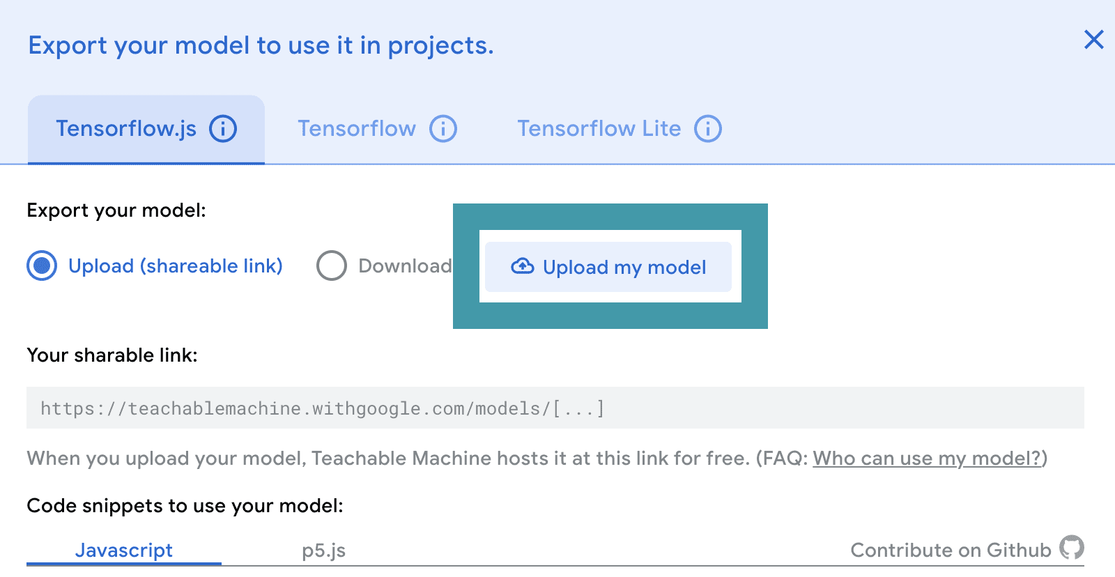 It is a good idea to save your model in case you want to reference or change it later. To do this, click on the Teachable Machine menu and either download the file or save it to your Google drive.