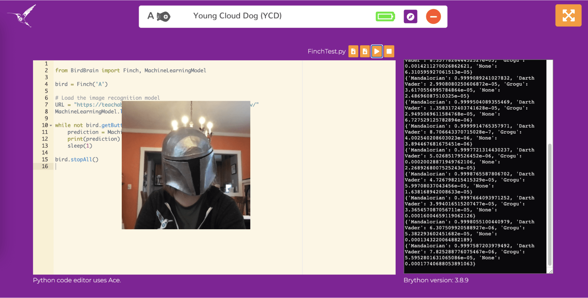 Open brython.www.zenstonetech.com and connect to the Finch. You should use the browser-based version of Python for this activity because it already has all of the machine learning methods that you will need.
