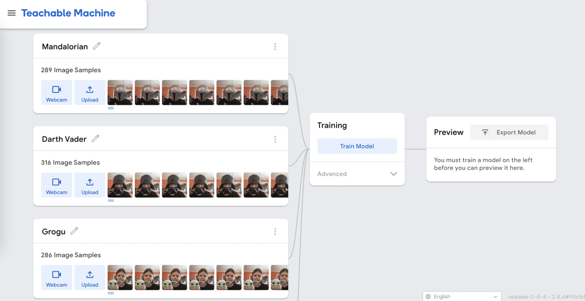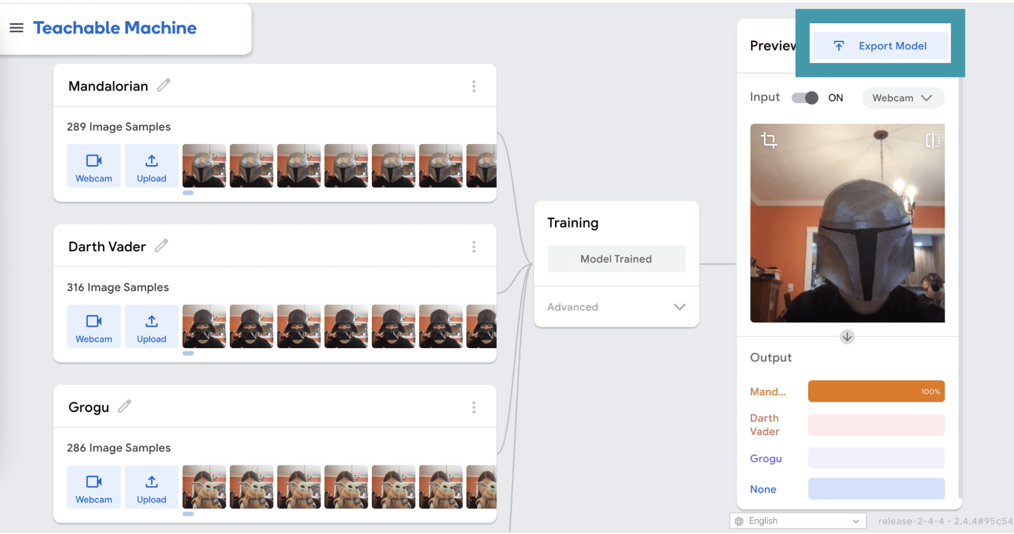 When the training is complete, you will be able to test your model in the Preview panel. Make sure that your model works the way that you want it to before moving on. If it doesn’t, you may need to add more image samples for each class and train again. When you are happy with your model, click Export Model.