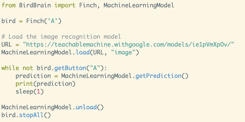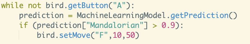 Challenge: Write a program to make the Finch respond to each of your images. For example, this video shows the Finch responding to three Star Wars characters (turn your sound on). As you test your program, notice what happens if the webcam sees an image that is not similar to something in your training data.