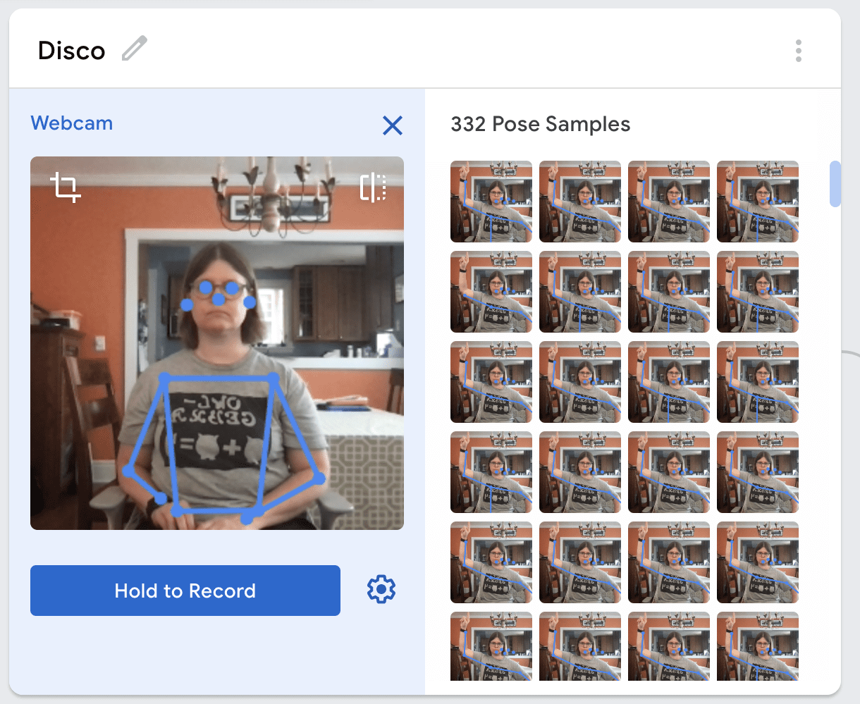 Next, get ready to record your poses. Make sure that you are centered in the webcam view and that you are far enough away from the webcam to see blue lines appear on your trunk and arms. This means that the Teachable Machine is tracking your skeleton. You will need to remain at about this distance from the camera when using your model, so you may want to mark the position with masking tape.