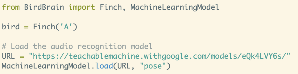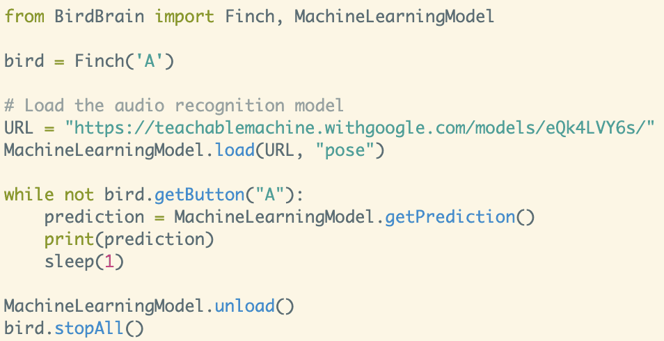 You can use the values returned by MachineLearningModel.getPrediction() to make the Finch perform certain actions when each class is detected. For example, this code changes the color of the Finch beak based on the pose that is detected. This can be a good way to check that your pose model is working properly.