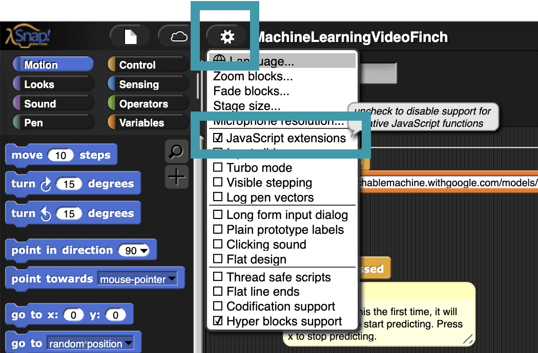 Watch the screen. If the model loaded correctly, you will see a message flash that reads “Model loaded successfully”. The URL will also update in the Snap! stage on the right. If you do not see this message, check that you pasted the URL correctly and try clicking the stack again.