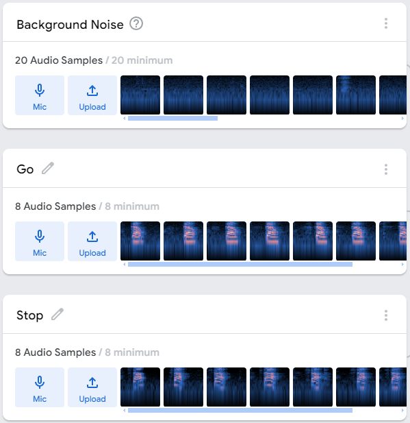 This is very similar to the process that you followed to create your Image Recognition model. For this Audio Recognition model, you will need three different classes, including a specific class for background sound.