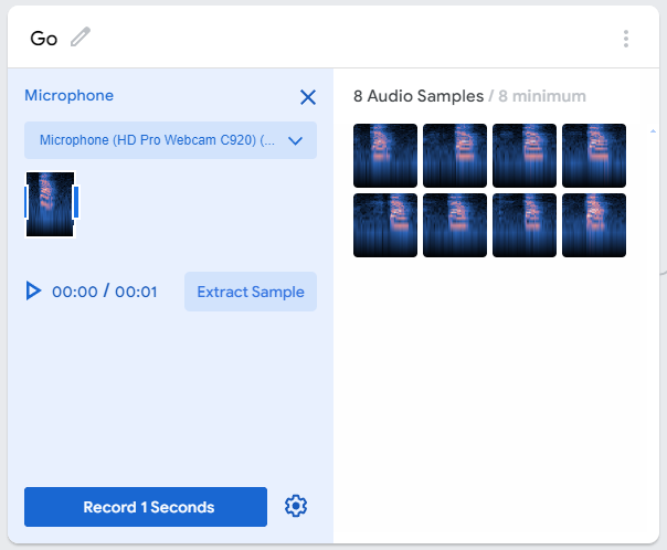 Next, add audio samples for your Go class. Click the Mic button and, when you are ready to record, click Record 1 Seconds. Say the word “Go” loudly and clearly.