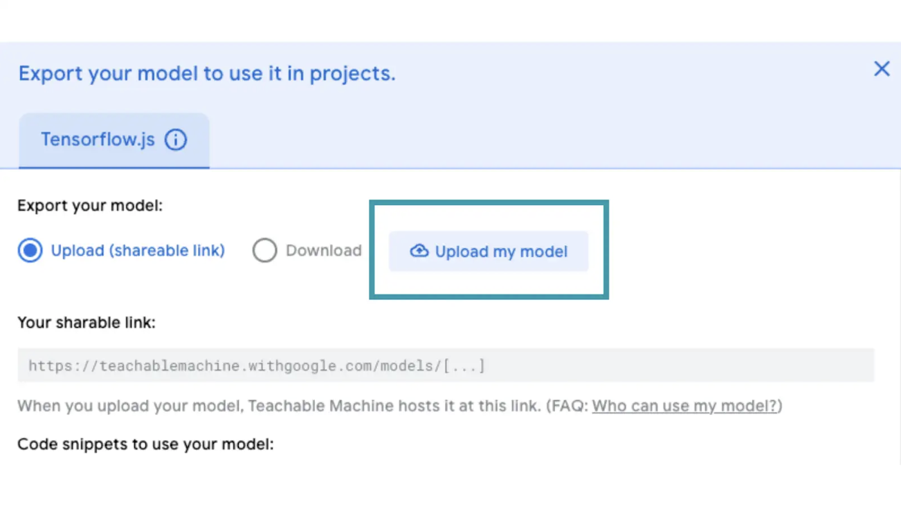 After your model has uploaded, you will see a sharable link highlighted in blue. You will need this link in the following steps to create a Snap! project with your model and complete this activity. Copy the shareable link. After you copy the link, you can close the export window. (You can always open the window and access the link again later.)