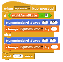 Here’s a snippet of the program responsible for controlling the right arm. Whenever the up arrow key is pressed, the program checks a variable we have defined called “rightArmState”. If the variable is 0, the arm goes down and the variable gets changed to a 1; if the variable is 1 the arm goes up and the variable is changed to 0. We also wait for a quarter second at the end to keep from triggering this code too often; the technical term for this is debouncing. If we didn’t debounce and touched the hot spot for a fraction of a second it might still trigger our code four or five times.