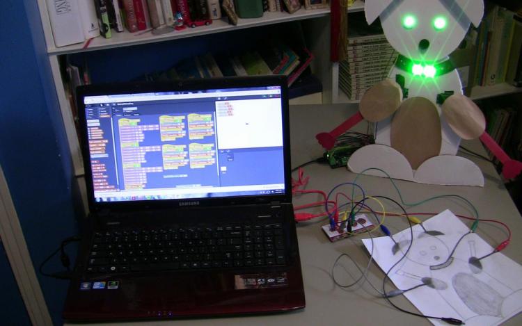 Our setup: a MaKey MaKey connected to a pencil drawing of our friendly dog robot. The MaKey MaKey has five alligator clips connecting to the drawing. We’ve made dark hot spots that have enough pencil lead to be conductive on the drawing’s arms, ears, and collar. The connections are as follows: