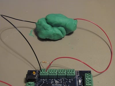 Did you know that you can use conductive dough as a sensor? You can sense whether someone is pulling a ball of dough apart, twisting it, or squishing it together. To create a playdough sensor, take a single ball of dough and stick a black wire and a red wire into opposite ends of the dough. Connect the black wire to a sensor port’s ‘-‘ terminal. Connect the red wire to the ‘S’ terminal (not the ‘+’ terminal). Now take a resistor (we used this 470 ohm one), and push one lead of the resistor into the ‘+’ terminal of the sensor port. Put the other lead of the resistor into the ‘S’ terminal; there is enough space in the terminal for both the red wire and the resistor’s lead. Then check the sensor value in Snap! – it will change as you pull or twist the playdough, as well as if you break the playdough apart or squish it close together.