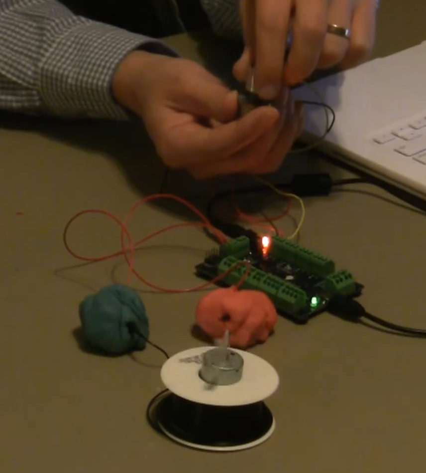 We’ve found that we can control the piezo-electric buzzer in the Squishy Circuits kit with the Hummingbird’s LED port. To do so, create two blobs conductive dough, put the red wire from the buzzer into one, and hook this blob up to the LED’s ‘+’ terminal. Put the black wire from the buzzer into the other blob and hook it up to the LED’s ‘-‘ terminal. We’ve found that you need to power the port to at least 60% before the buzzer turns on.