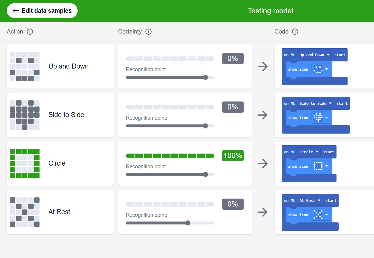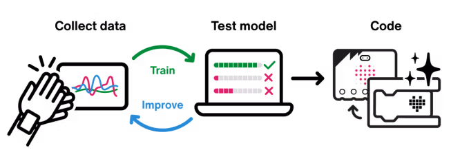 ML also works well in education because it can be simplified to work with small sets of data. This makes it ideal for classroom use with the micro:bit, allowing students to experience how ML works for themselves using personal movement data they gather from the micro:bit’s accelerometer sensor.