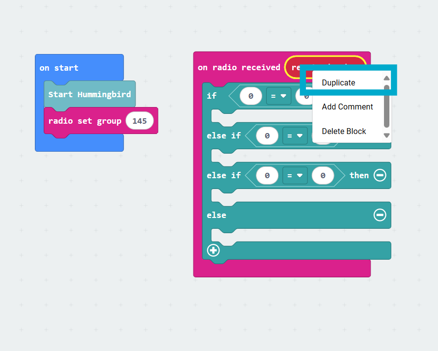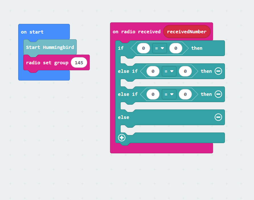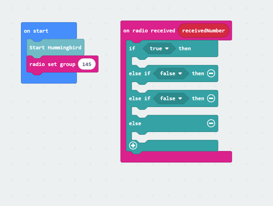 Now that your radio sender and receiver codes are built, let’s add some commands for the Hummingbird! The code on the right will make your starter project do the following tasks based on the magic wand gestures: