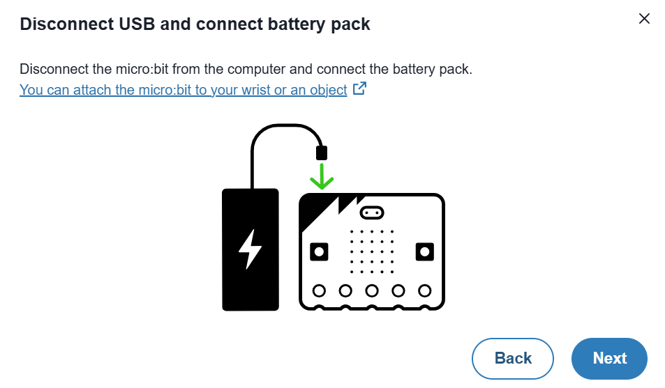 3. Connect your V2 micro:bit attached to your wand to your computer using the USB cable. Select the blue Connect button at the bottom of your screen and then follow the on-screen instructions to turn your model into a datalogger micro:bit.