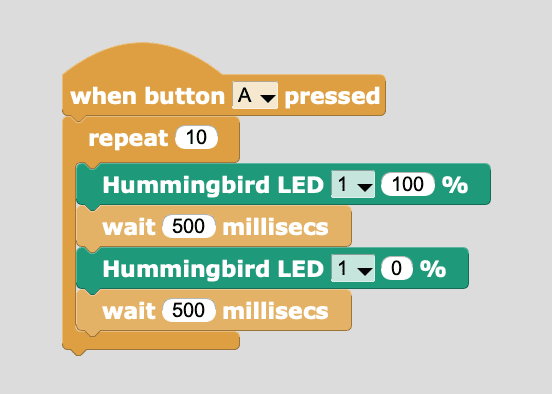 As you write programs, they are automatically downloaded to the micro:bit. As an example, this program makes the LED blink 10 times when button A on the micro:bit is pressed. All the yellow blocks can be found on the Control menu. Run this program once, and then disconnect the USB cord from the micro:bit. You can still press button A to run the program! Please note that the Hummingbird still needs power, so it will need to be plugged in to the battery pack or power adapter.