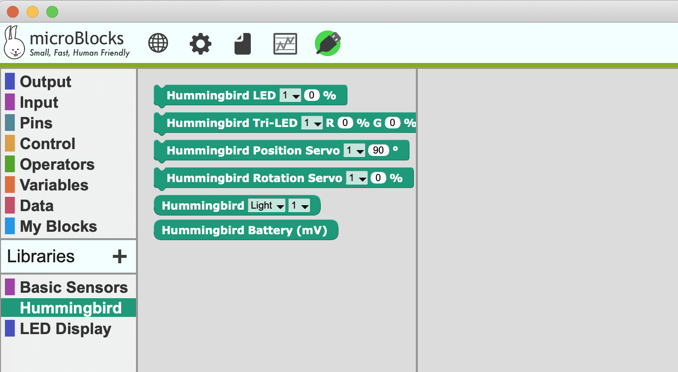 MicroBlocks is a free, Scratch-like programming language specifically designed for microcontrollers. With MicroBlocks, scripts run immediately right on the micro:bit without downloading, which means you can explore blocks and easily test your code. The code continues to run when the micro:bit is disconnected from the computer, making MicroBlocks perfect for for creating projects with the Hummingbird Bit!