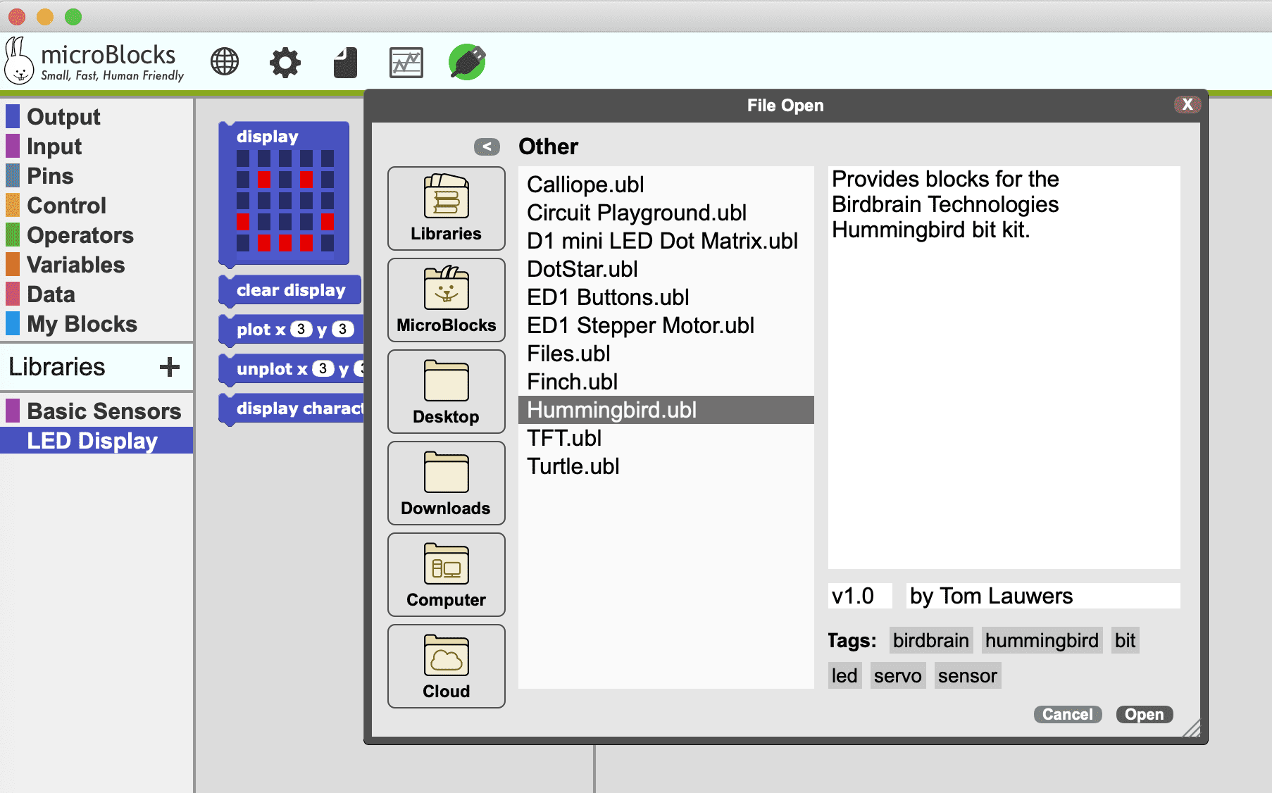 To use MicroBlocks with the Hummingbird Bit, you will need a computer – Windows, Mac, Chromebooks, and Linux are all supported. Start by downloading and installing MicroBlocks from this page.