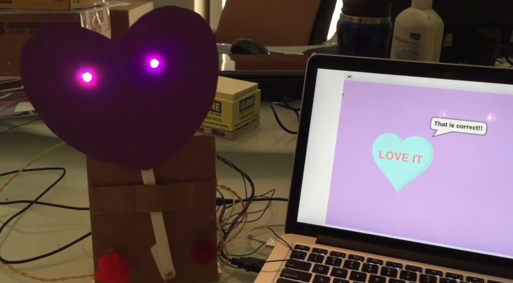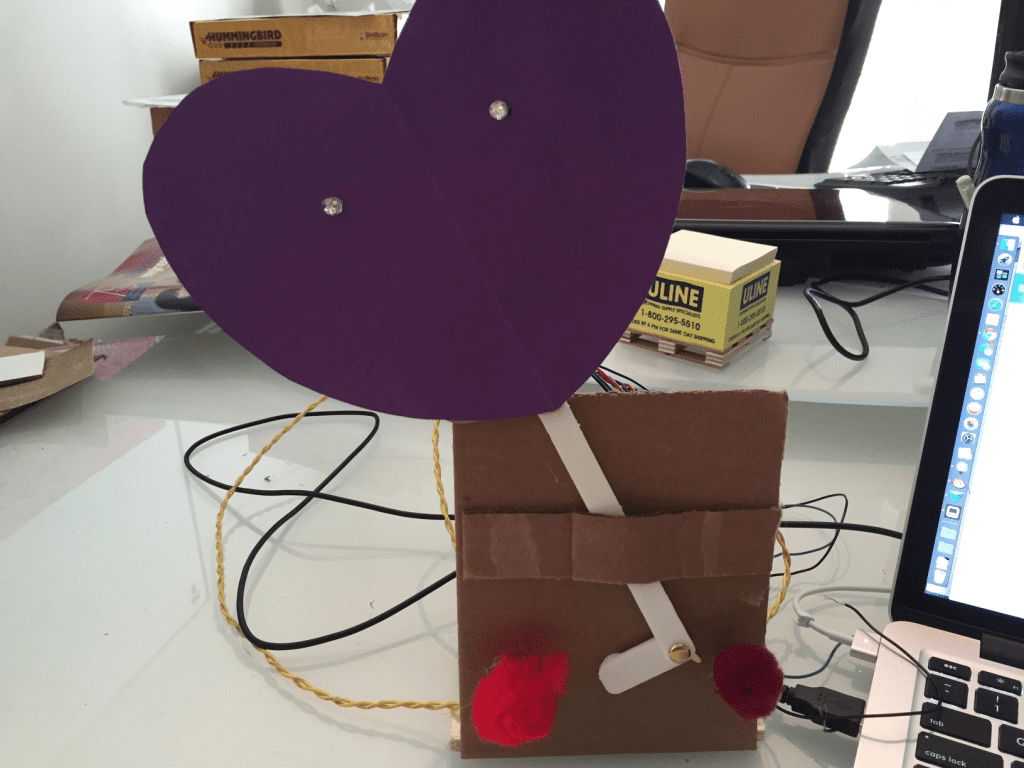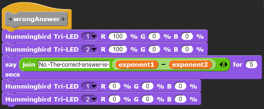 After computing the correct answer, the program uses both the screen and the Hummingbird robot to tell the user whether their answer was correct or incorrect. The robot includes two tri-color LEDs and one rotation servo. When the user is correct, a custom block makes the two LEDs teal and purple, while the rotation servo uses a small linkage to move a purple heart. When the user is incorrect, another custom block turns the lights red and vibrates two red pom-poms. This custom block includes a parameter that tells the user the correct answer to the problem.