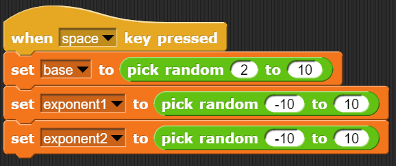 Snap! does not contain an operator that will compute the answer to this question. To check the user’s answer, students must add the exponents together (technically, they could also use recursion, but we will not consider that approach here). Implementing this in the game reinforces the rules for working with exponents.
