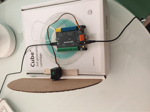 In this project, the servo motor is mounted behind a semicircle that has a variety of fractions labelled on it. The program moves the servo motor to point at different fractions while speak or say blocks are used to explain how different unit fractions add up to a fraction that is equivalent to one half. For example, the program states that 3/6 is the same as 1/2. Then it points to 1/6, then 2/6, then 3/6.