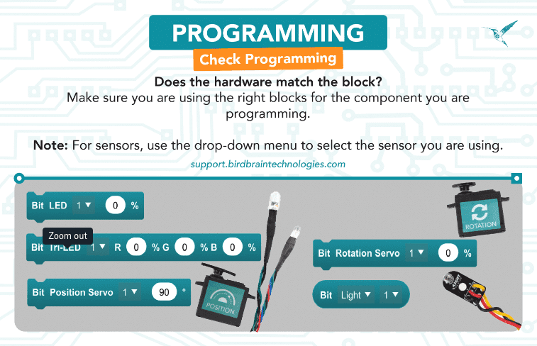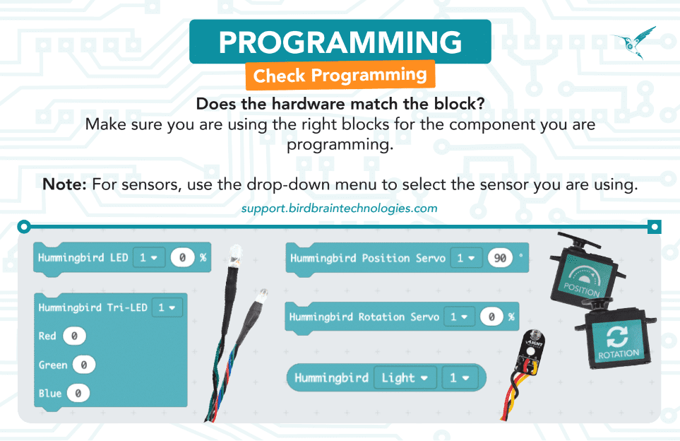 Debugging is part of the creative process! Use these cards to troubleshoot your Hummingbird Bit Robotics Kit in BirdBlox, MakeCode, and Snap!.