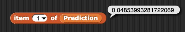 The stage also shows a list variable named Prediction. While the classifier is predicting, you can use the values in this list to control Hummingbird components. Each item in Prediction corresponds to a row in the table. For example, the first item in Prediction is the probability for the first class.