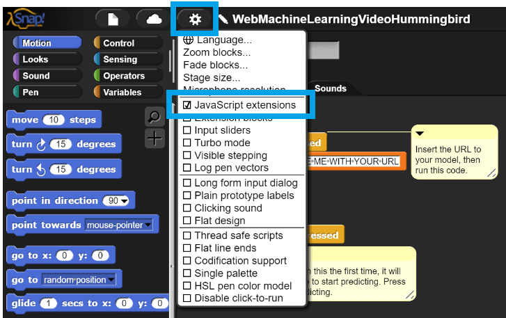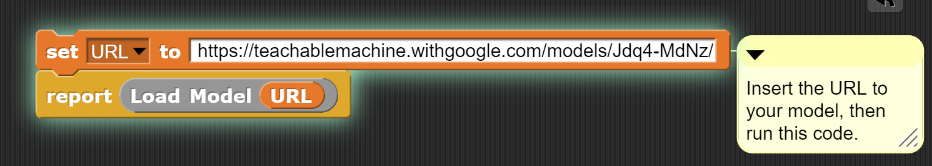 Modify the top script to set the URL variable to the link for your classifier. Then click on this stack of blocks to run the top script. You will only need to run this script once to load the libraries and the model. If the URL was correct and the model loaded correctly, you will see a message that reads “Model loaded successfully”. If this did not happen, check that the URL is correct and try clicking the stack again.