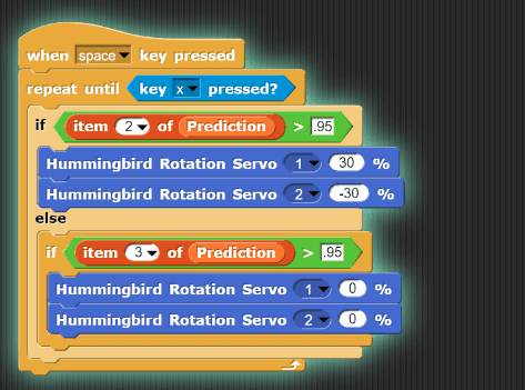 Challenge: Write a program to make a Hummingbird respond to each of your words. As you test your program, notice what happens if you say a word that your model does not know. What happens if a different voice says the trained words? In the example below the Hummingbird rover goes forward when the program hears “go” and stops when it hears “stop”.