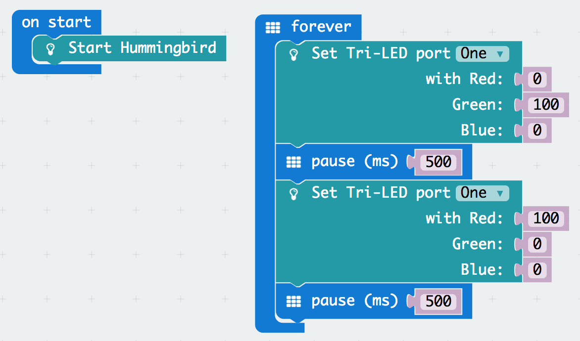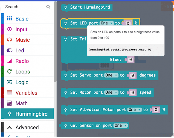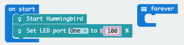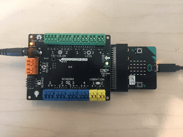 Now you can use the micro:bit to control your Hummingbird! You can write programs in the block-based MakeCode environment and then download them onto the micro:bit. Then you can disconnect the robot from the computer but keep running your program! To use the Hummingbird with micro:bit, you will need a Hummingbird micro:bit adapter. Because it is browser-based, MakeCode is compatible with Windows, Mac, Linux, and Chromebooks.