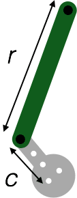 - Measure c and r for your crank mechanism. The length of the rod should be measured from the center of the connecting pin to the center of the hole at the end of the rod. The length of the crank should be measured from the center of the motor to the center of the connecting pin at the end of the crank, as shown in the picture below.