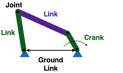 As the crank rotates, it causes two other links to move while the ground link remains fixed in position. Varying the lengths of the links produces different patterns of movement.