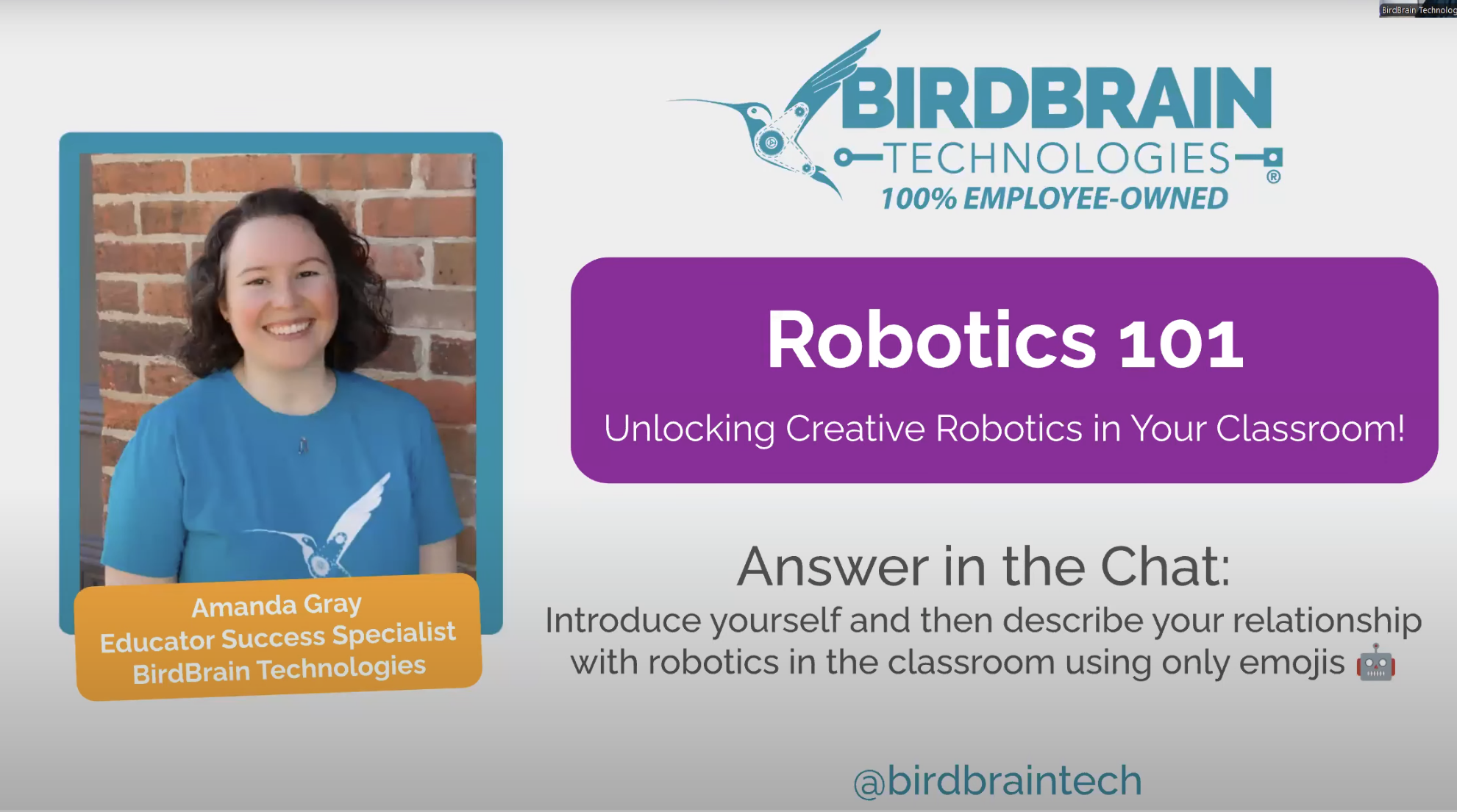 Robot Open House – Exploring STEM in Every Subject, a Wednesday Webinar with IDEA Join the BirdBrain Technologies Team and the Illinois Digital Educators Alliance for a Robot Open House as we venture through the full school day, exploring robotics and coding in every subject. | Watch |