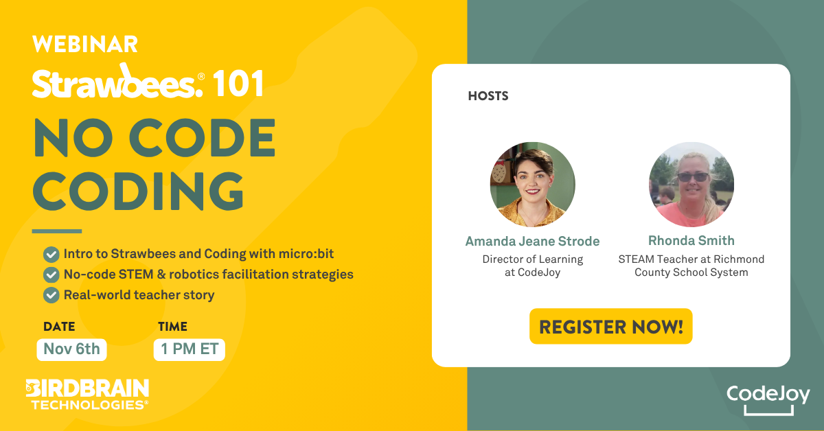 Strawbees 101: No-Code Coding with CodeJoy You don’t need a computer science degree to teach coding — just creativity and the right tools. Join CodeJoy’s Amanda Jeane Strode and STEAM teacher Rhonda Smith for a fun, hands-on webinar exploring no-code coding strategies that make computational thinking accessible for every classroom. You’ll learn how to use the Use-Modify-Create framework, get a tour of the Strawbees Classroom platform, and discover activities that spark student ownership, creativity, and engagement — all without writing a single line of code. Walk away with ready-to-use lessons, teacher-tested insights, and inspiration to bring coding to life with your students. Download the webinar resources | Watch |