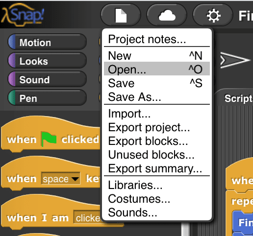 To open a file you saved previously, first log in to your Snap! cloud account. Then go to File and then Open.