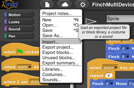 Note: Programs written in Snap! using the BlueBird Connector for Mac/Windows cannot be run on a Chromebook, and vice versa. If you need to convert a saved program from one platform to another, you can use this online converter.